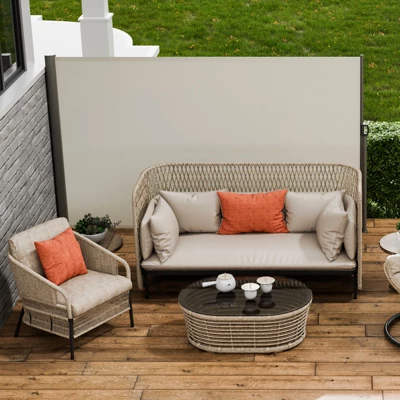 High-Quality Material: Our retractable side awning is made from 280g/m² high-density polyester fabric with a PU coating, providing excellent waterproof performance and tensile strength. It effectively blocks wind and rain, resists UV rays (UV30+), extends its lifespan, and ensures stable shelter for outdoor activities.