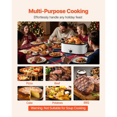 Large 26QT Capacity: VEVOR electric roaster oven easily accommodates an entire turkey in its generous 26QT size. Ideal for Thanksgiving, Christmas parties, or weekend dinners, it makes family meals and festive gatherings simple and impressive.