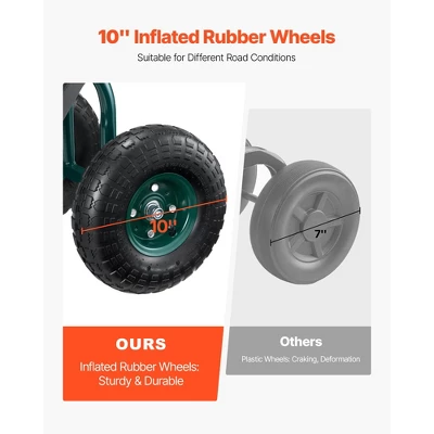 10-inch All Terrains Tires: Equipped with four 10-inch inflatable tires with deep, anti-slip tread, this outdoor garden cart with wheels provides excellent grip on wet, muddy, or uneven terrain, preventing slipping or tipping. Whether in your backyard, garden, or garage, this cart easily handles all types of ground, ensuring a smooth gardening experience.