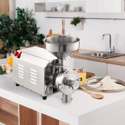 Premium Stainless Steel: This commercial corn grinder mill adopts premium stainless steel material with a smooth surface, avoiding powder accumulation on the inside wall. The structure features good corrosion and rust prevention. It is easy to clean for long service life. This electric grain mill grinder fits your kitchen perfectly with its attractive appearance. It is used for dry grain, not for wet and oily grain.