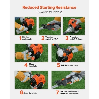 Easy Start, Safe and Comfortable: Equipped with a high-safety throttle guard to prevent accidental starts, this weed wacker features a 550ml fuel tank that reduces refueling frequency. The 40:1 fuel mixture ensures smooth operation and minimizes starting resistance.