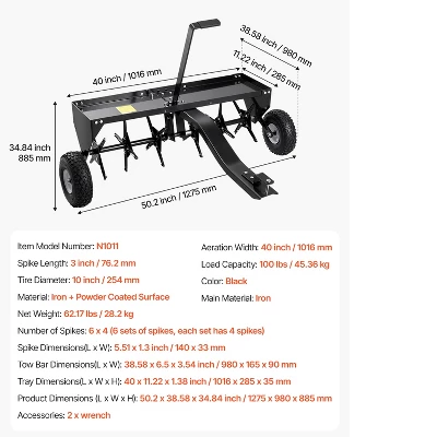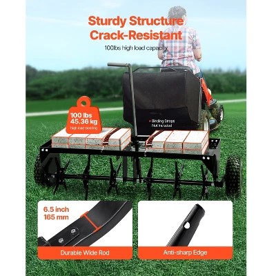 100lbs Load Capacity: The high-load capacity tray of tow behind aerator allows you to place heavier items, increasing the spike penetration power. Each spike is designed with a protective edge to reduce risks. The reinforced bars and universal hitch easily connect to various tractors and are durable and long-lasting.