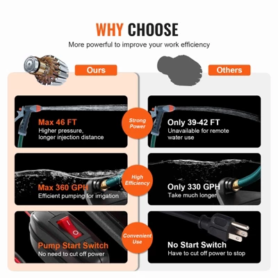 Revolutionary Water Transfer: Are you ready for quality water control? Experience unbeatable efficiency with our 1/10 HP 12V DC water transfer pump, delivering up to 360 gallons per hour and a 46 ft pumping height. Note: 1. This pump is designed for short-term use and should not run continuously for extended periods. We recommend limiting each use to no more than 2 hours. 2. The series-wound motor operates at high speed and generates significant noise. Please wear ear protection.